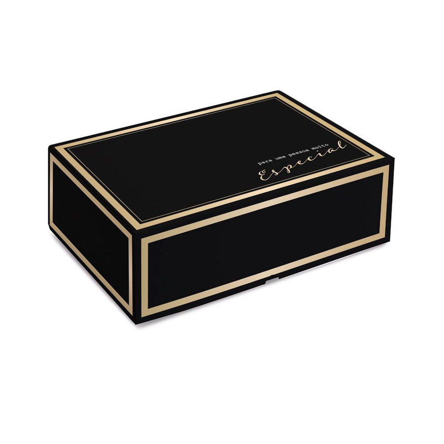 Caixa retangular preta com linhas na cor ouro fosco contornando os lados da caixa, destacando a mensagem "Para uma pessoa muito especial", com a estampada internamente, quadriculado com o fundo branco e algumas linhas de tinta destacando outra mensagem "Com Carinho"