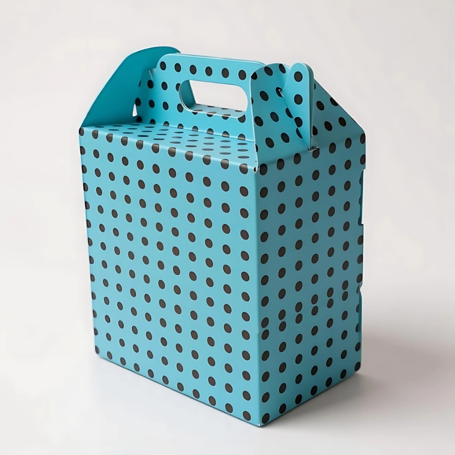 A Caixa Sacolinha S1 mede 9,5x6,5x4,5cm e é confeccionada em papel cartão estampado. Seu acabamento azul com bolinhas marrons traz um estilo divertido e delicado. Possui fechamento tipo sacola, com alças integradas, ideal para acondicionar doces, lembranças e pequenos brindes.