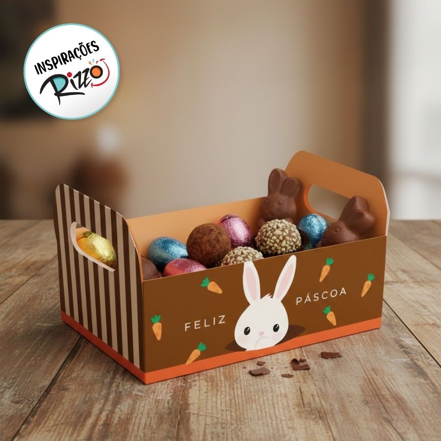 Produzido em papel cartão resistente, o caixote garante estrutura firme e um acabamento de qualidade, enquanto o visual em laranja com a estampa Coelho Sai da Toca traz um toque divertido e atrativo à apresentação. É uma excelente opção para confeiteiros, lojas e artesãos que desejam valorizar seus produtos com uma embalagem prática e visualmente marcante.
