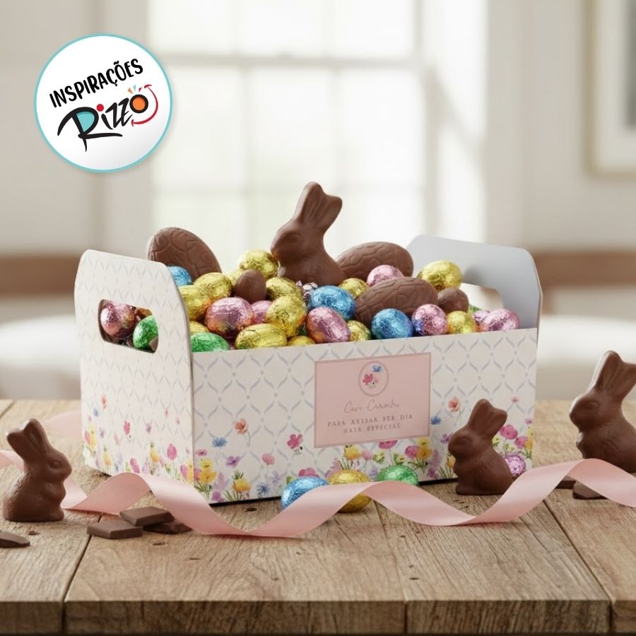 Produzido em papel cartão resistente, o caixote garante firmeza, durabilidade e um acabamento refinado, sendo ideal para Páscoa, lojas de presentes e montagem de kits personalizados. O design Florens permite diversas personalizações com fitas, tags, palha decorativa e celofane, resultando em composições únicas e encantadoras.