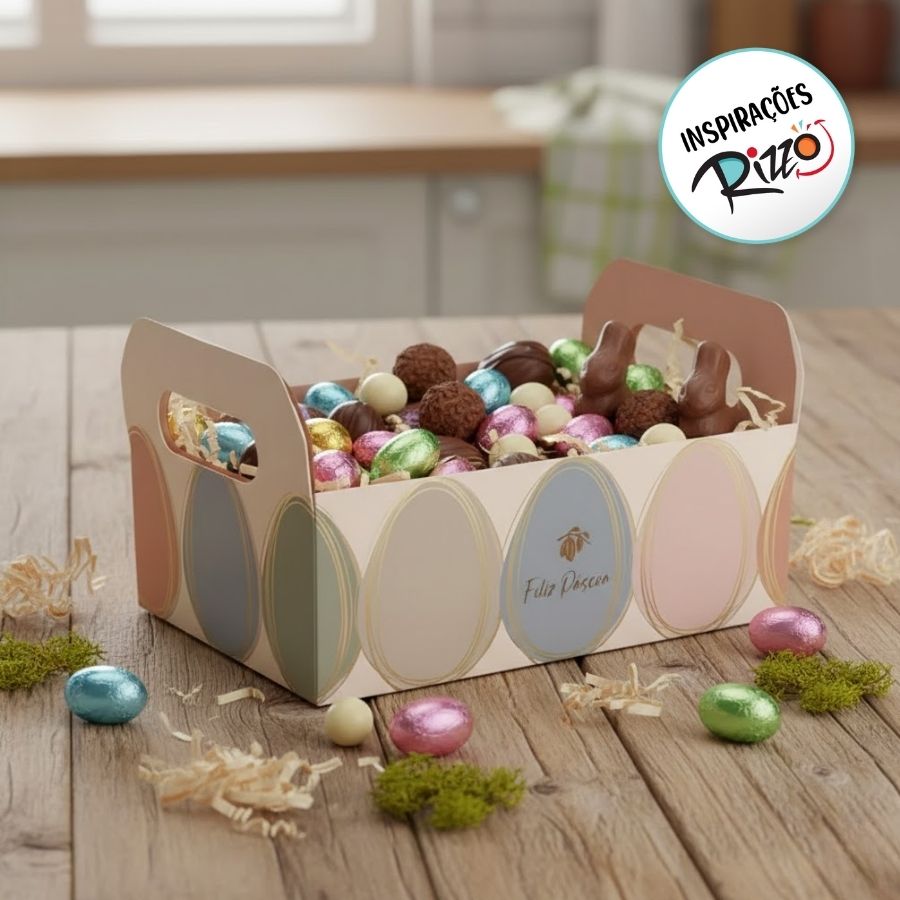 Produzido em papel cartão resistente, o caixote oferece firmeza, durabilidade e um acabamento elegante, sendo ideal para Páscoa, lojas de presentes e montagem de kits personalizados. O visual tonal com a mensagem Feliz Páscoa traz um toque sofisticado e festivo, valorizando ainda mais o presente.