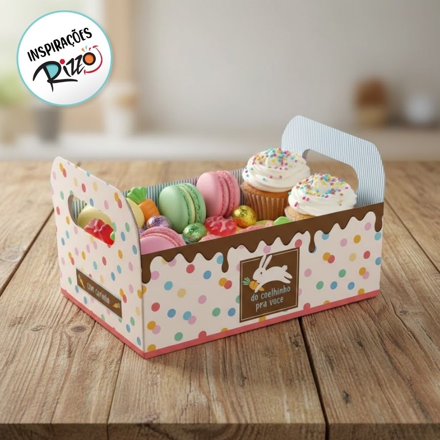 O Caixote de Papel Cartão modelo Jump – Do Coelhinho Pra Você é uma embalagem espaçosa e encantadora para montar cestas e kits presenteáveis de Páscoa. Com medidas de 25x19x10cm, ele oferece amplo espaço para acomodar ovos de chocolate, doces, pelúcias, bebidas e itens decorativos, criando uma apresentação bonita, organizada e valorizada.