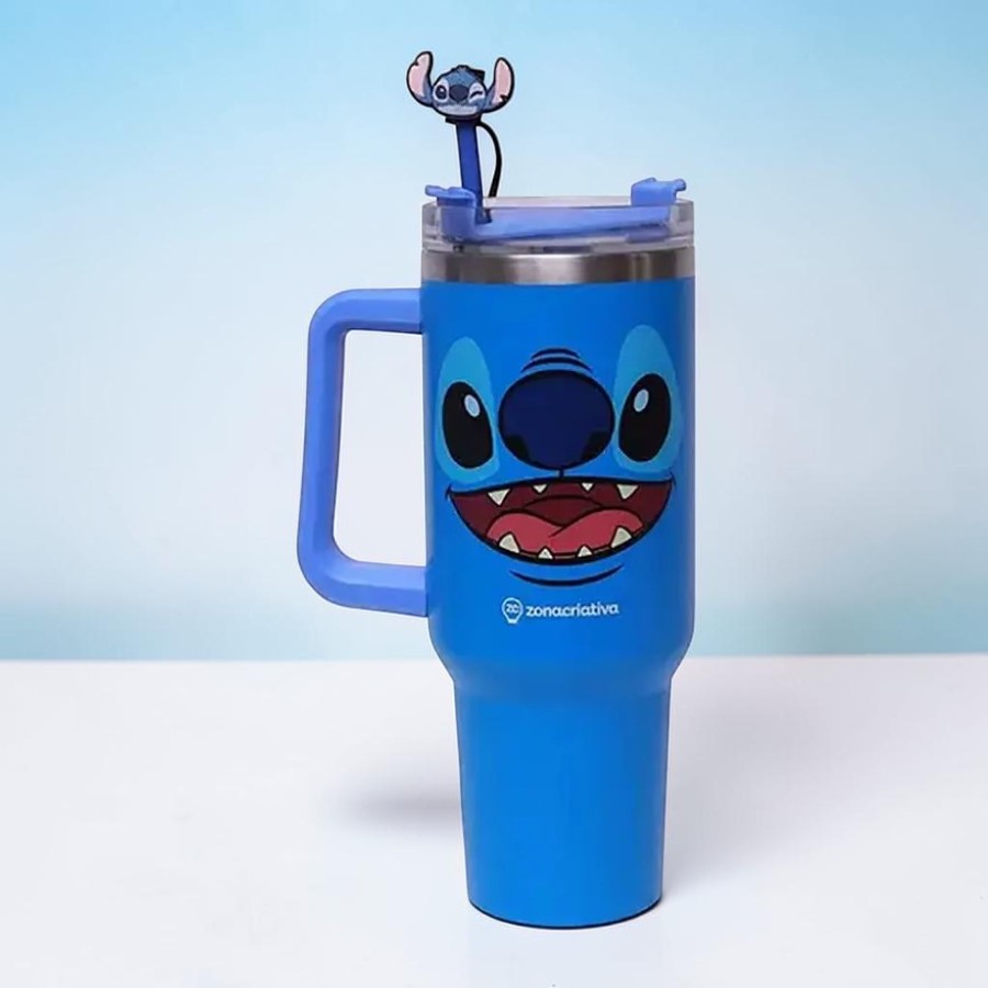 Caneca térmica com tampa e canudo com estampa inspirada em Stitch Disney Produto Licenciado.