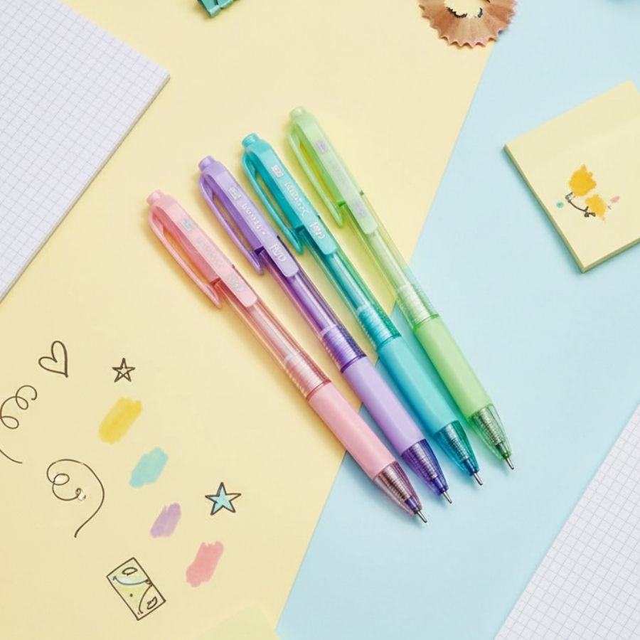 Possui carcaça em cores sortidas, disponíveis em rosa, verde, roxa e azul, trazendo um visual moderno e atrativo. Seu design funcional proporciona bom encaixe na mão, garantindo conforto mesmo em períodos prolongados de escrita. A tinta de qualidade assegura escrita contínua e secagem rápida, evitando borrões.