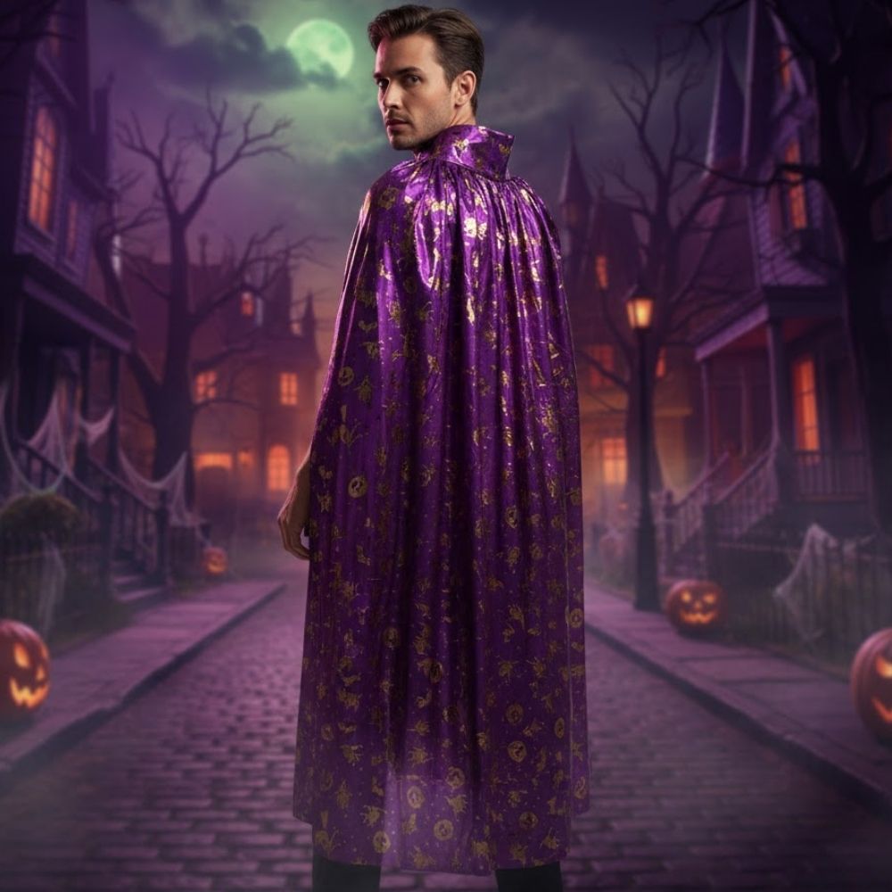 A capa de bruxa para Halloween é perfeita para compor fantasias cheias de mistério e charme. Confeccionada na cor roxa, ela possui detalhes dourados temáticos com estampas de abóboras, estrelas, gatinhos e morcegos, criando um visual encantador e clássico do Halloween. Seu comprimento de 140cm garante um caimento marcante, ideal para fantasias adultas completas e impactantes.