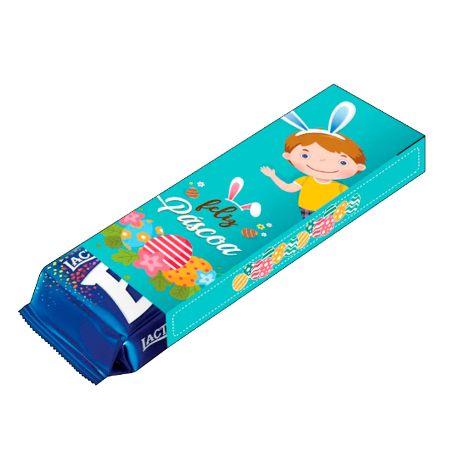 Capa estampada para caixa de bis, com tematica de páscoa com fundo azul turquesa, destacando um menino usando tiara de orelhas de coelho acenando, abaixo dele há a mensagem "Feliz Páscoa" e ovos da páscoa abaixo da frase