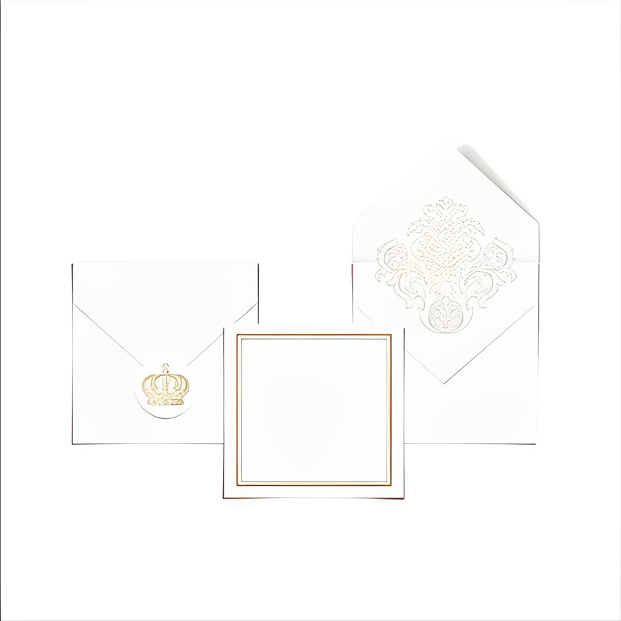 Pacote com 24 conjuntos de cartas de agradecimento, com envelope estampado, cartão e adesivo estampado. Envelope estampado com uma figura arabesco e adesivo com a figura de uma coroa, e a carta com um cabeçalho dourado