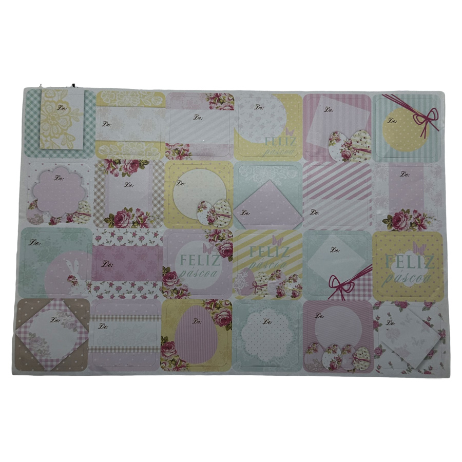 2 cartelas com 24 adesivos, diferentes um do outro, com a intenção de presentear há o espaço e a palavra "de:" para indicar quem foi o mandante, com muitos adesivos listrados e pontilhados romanticos e a mensagem "Feliz Páscoa"