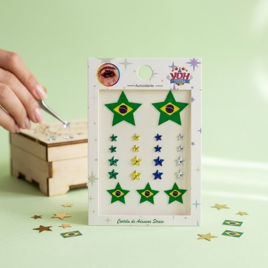 Se você quer praticidade sem abrir mão do brilho e da originalidade, a cartela de adesivo facial strass é ideal para transformar qualquer momento em uma festa cheia de energia e estilo. Cartela de adesivo facial com strass perfeita para criar looks de torcida criativos, brilhantes e cheios de estilo em jogos, festas e eventos da copa do mundo.