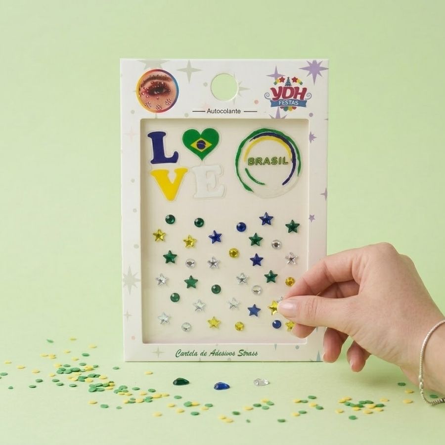 É a escolha perfeita para quem quer torcer com muito brilho, estilo e praticidade. Com pedras de strass reluzentes e design moderno, essa cartela de adesivo facial copa do mundo oferece fácil aplicação e excelente fixação na pele. Ideal para compor looks criativos, o produto é leve, confortável e proporciona um acabamento sofisticado, destacando o visual com as cores e o espírito da torcida. Versátil e funcional, o adesivo facial com strass pode ser utilizado em festas da copa, eventos esportivos, encontros entre amigos, bares, fan fests e até em produções fotográficas e vídeos. A cartela permite criar diferentes combinações no rosto, podendo ser aplicada ao redor dos olhos, bochechas ou testa. Combine com maquiagem temática, glitter, camisetas da seleção e outros acessórios para um visual completo e impactante. Também é uma excelente opção para fantasias copa do mundo e looks personalizados de torcedor.