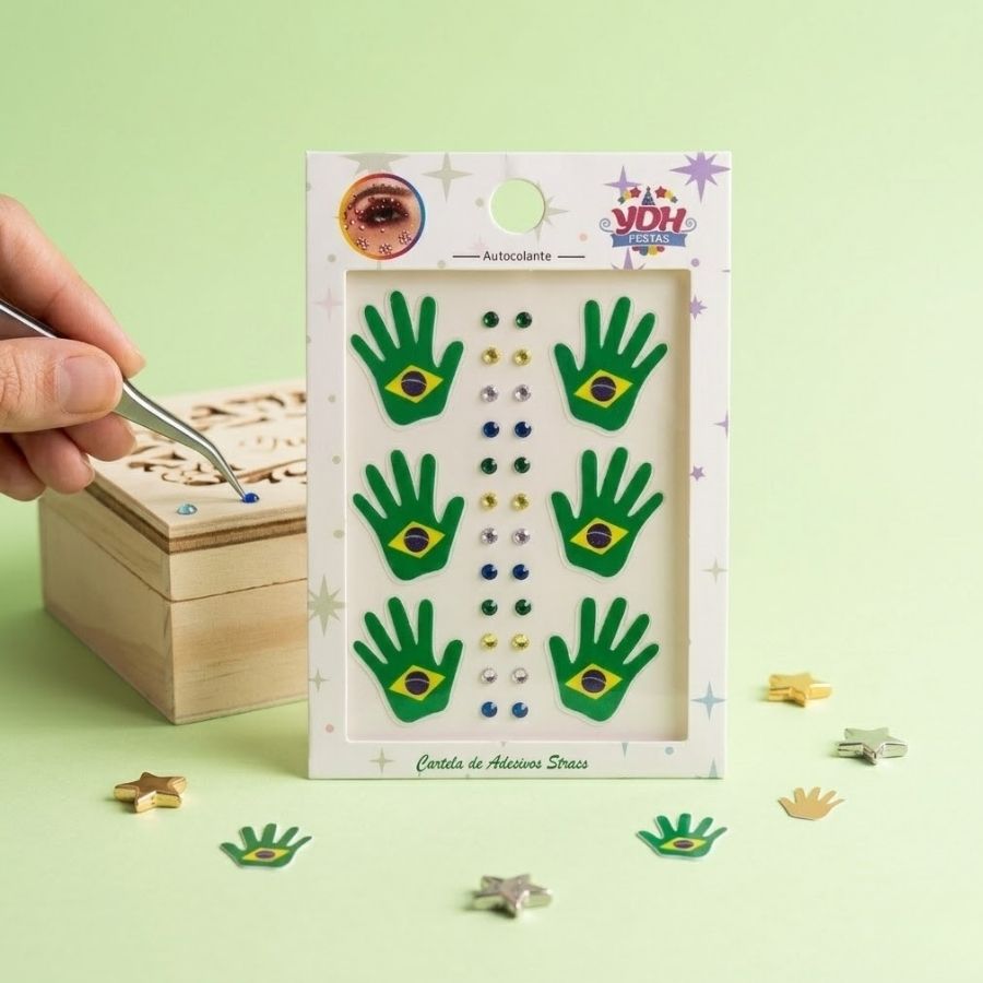 Se você quer praticidade sem abrir mão do brilho e da originalidade, a cartela de adesivo facial strass é ideal para transformar qualquer momento em uma festa cheia de energia e estilo. Cartela de adesivo facial com strass perfeita para criar looks de torcida criativos, brilhantes e cheios de estilo em jogos, festas e eventos da copa do mundo.