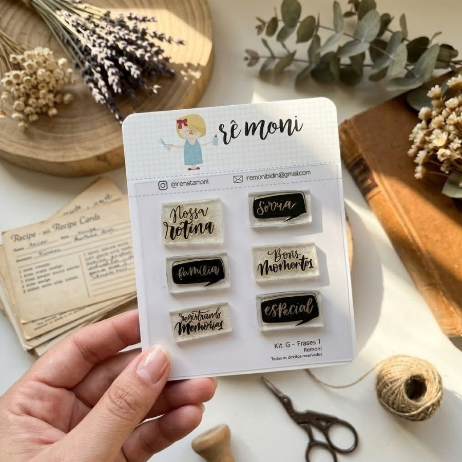 Carimbos artesanais para fins decorativos com frases; "Sorria, Nossa Rotina, Família, Bons Momentos, Registrando memórias, Especial".