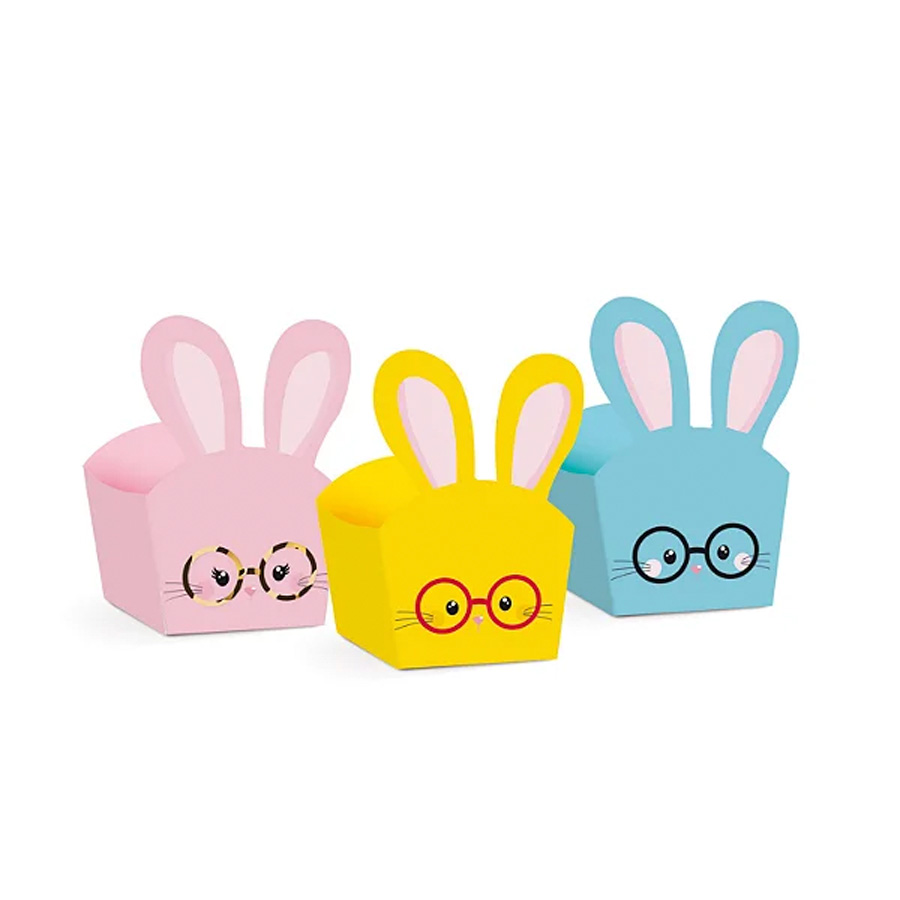 Caixas cestinhas de papel cartão, com rostinhos estampados com um fucinho, bigode, par de olhos e 1 oculos, e acima da estampa a cesta tem um par de orelhas de coelho, há 10 unidades no pacote dividido em 3 cores diferentes, rosa, azul e amarelo, com todas as caracteristicas descritas acima