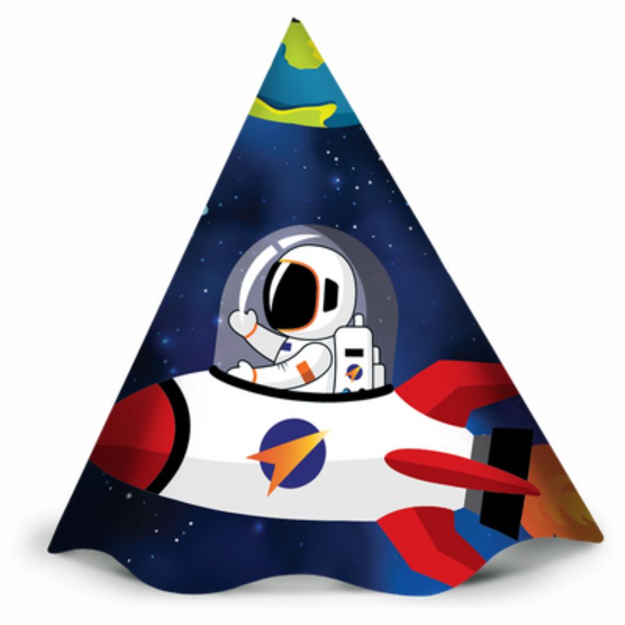Chapéus de aniversário com tema espacial, ideais para festas infantis e celebrações temáticas. Pacote com 8 unidades.
