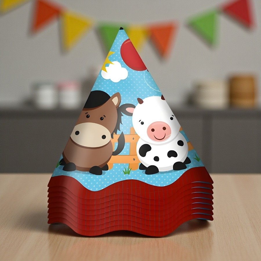 O Chapéu de Aniversário Fazendinha mede 16x13cm, confeccionado em material resistente e seguro para crianças. Ideal para compor kits de festa e decorações temáticas, garantindo praticidade, charme e diversão.