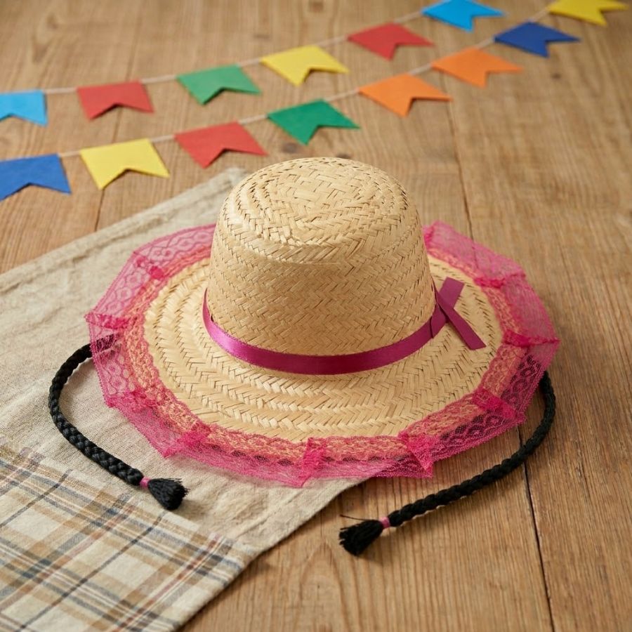 O Chapéu de Palha de Renda com Trança - Hot Pink - 19cm x 30cm é um acessório decorativo feito em palha, com detalhes em renda e trança, na cor pink. Ideal para festas juninas, fantasias e decoração temática, é leve, versátil e fácil de personalizar.