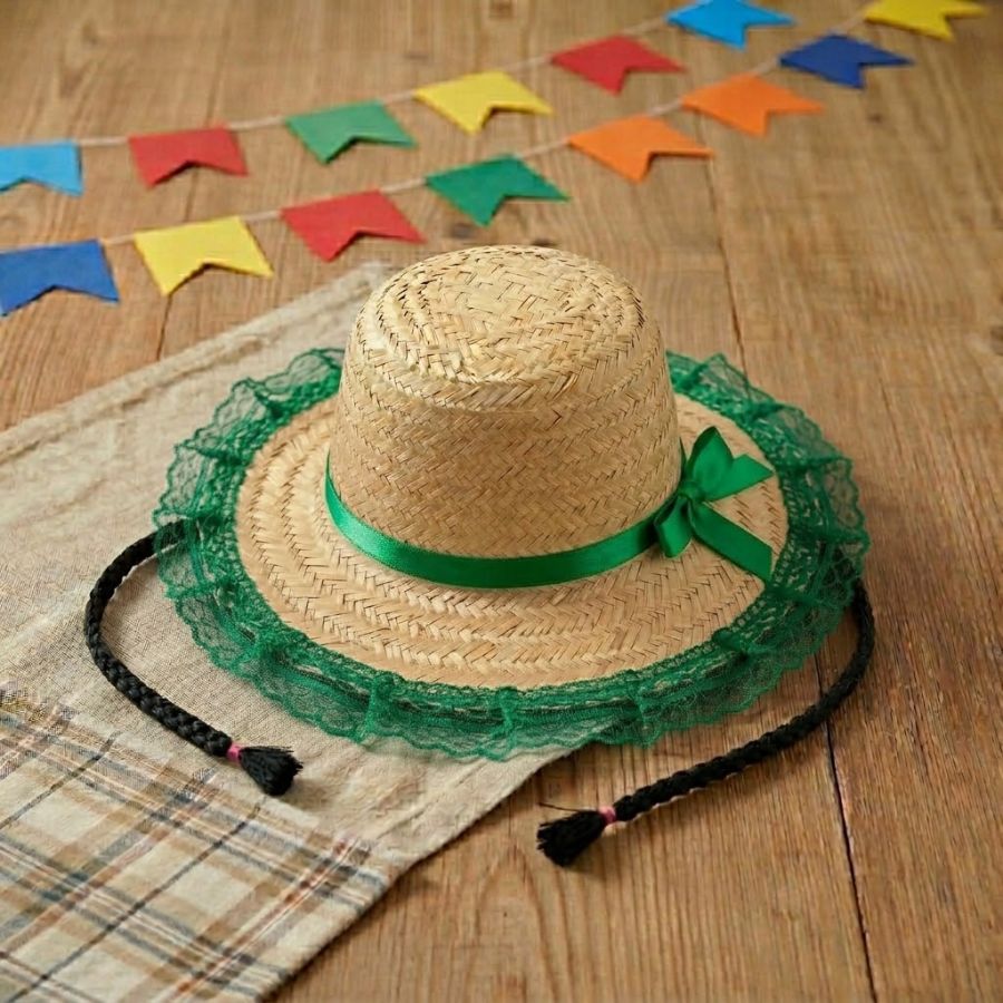 O Chapéu de Palha de Renda com Trança - Verde - 19x30cm é um acessório decorativo feito em palha, com detalhes em renda e trança, na cor verde. Ideal para festas juninas, fantasias e decoração temática, é leve, versátil e fácil de personalizar.