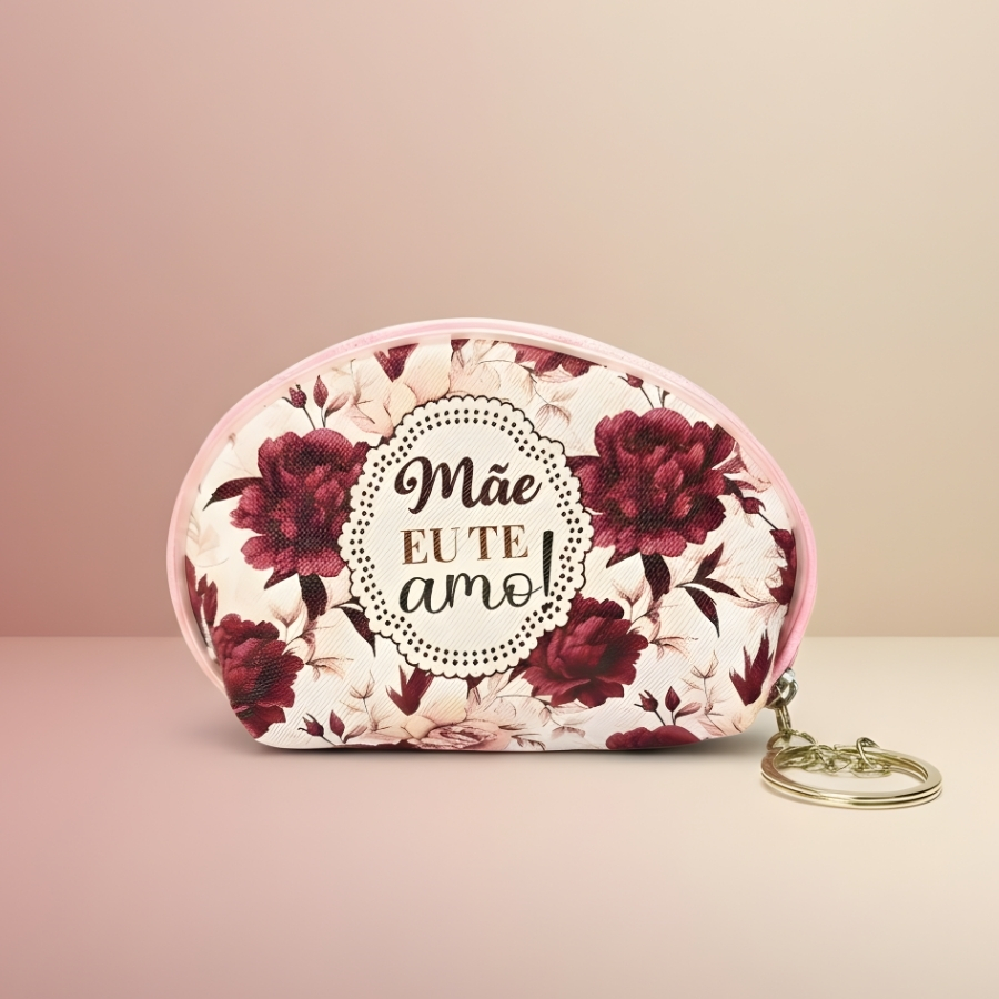 Chaveiro bolsinha porta moedas fabricado em material resistente nas cores branco e vinho, com dimensões aproximadas de 11cm x 7cm x 3cm. Possui estampa com a frase “Mãe Eu Te Amo”. Indicado para armazenamento de moedas, pequenas notas e objetos de pequeno porte. Não é resistente à imersão em água. Para limpeza, utilizar pano macio levemente umedecido e evitar produtos abrasivos para preservar a estampa e o material.
