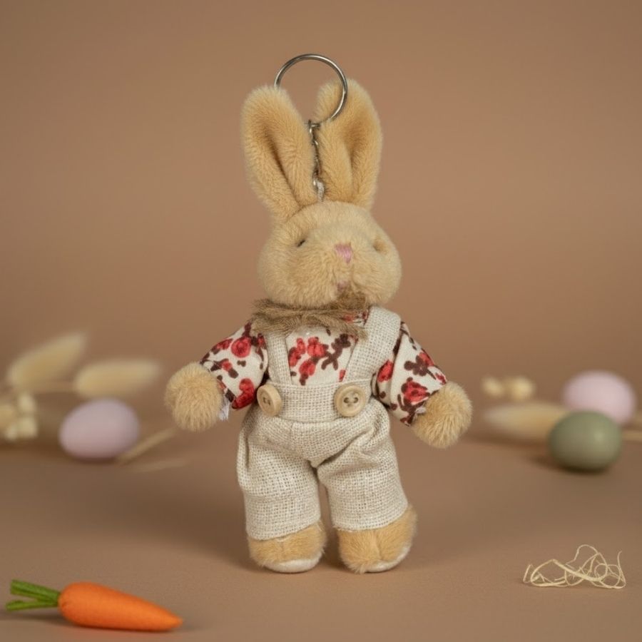 Chaveiro decorativo de coelho de pelúcia bege com macacão e blusa estampada de rosas. Ideal para lembrancinhas e presentes de Páscoa, mede aproximadamente 14x7x3cm e combina delicadeza, romantismo e funcionalidade.