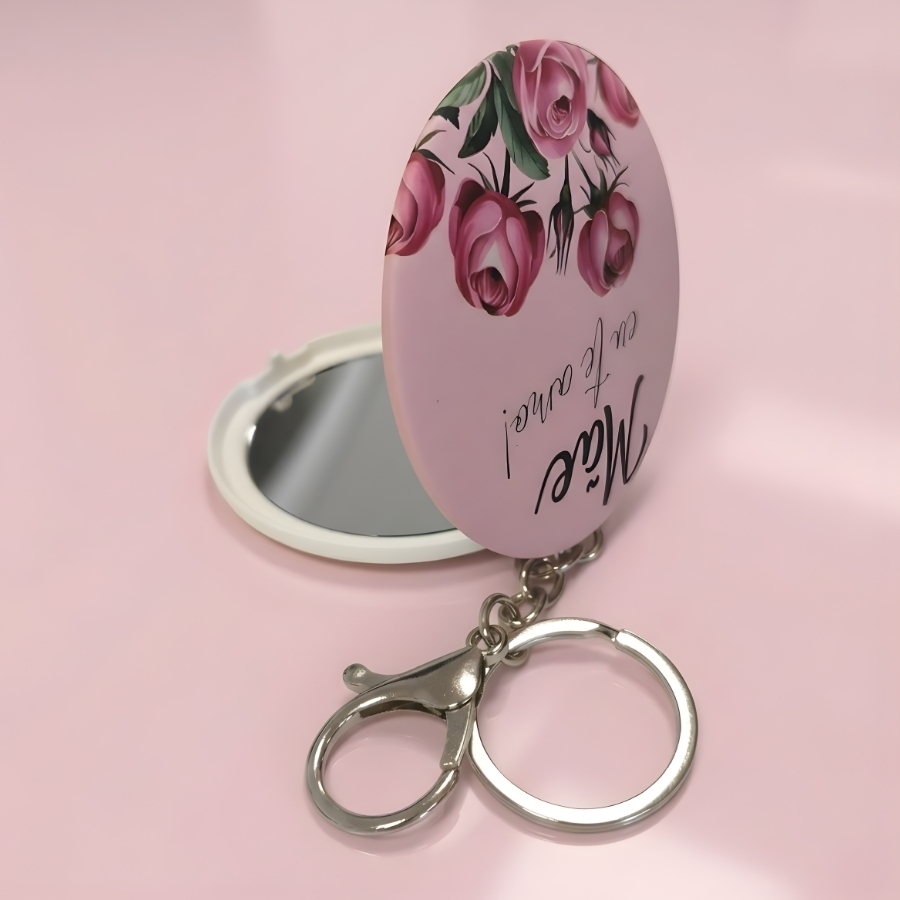 Na suave tonalidade rosa claro, esse chaveiro une delicadeza e funcionalidade. Compacto e prático, pode ser fixado às chaves, bolsas ou mochilas, oferecendo um espelho sempre à mão quando necessário. Um mimo útil e simbólico para presentear em datas especiais ou demonstrar amor no dia a dia.