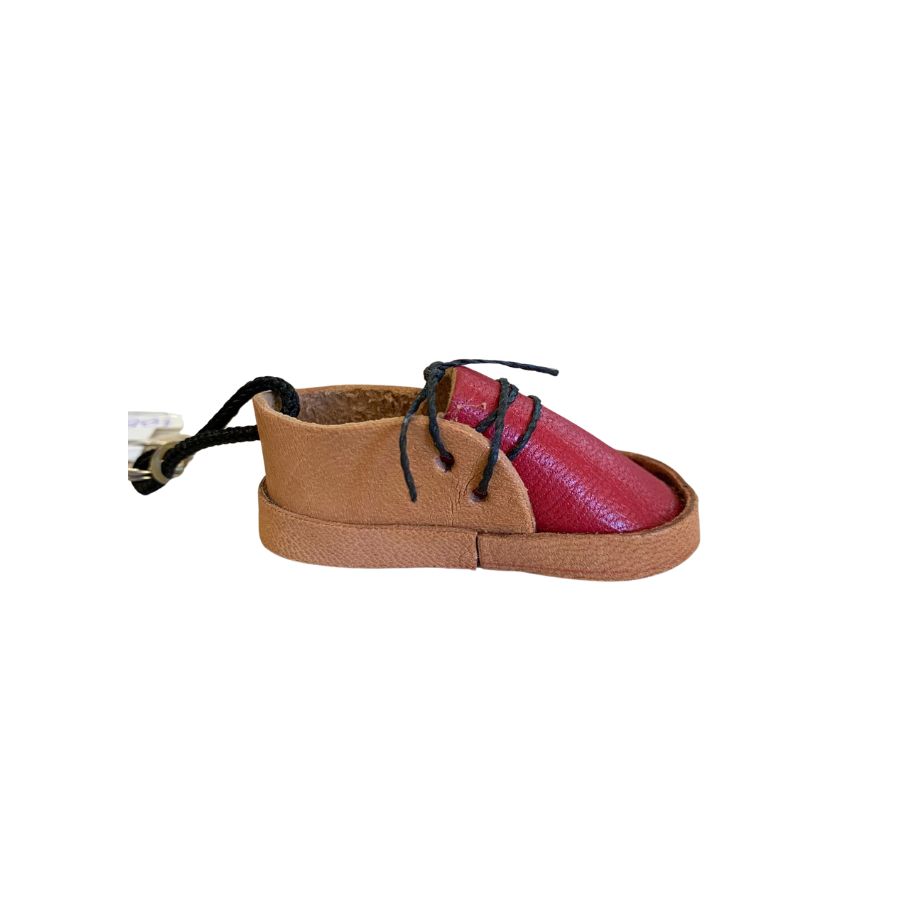 Chaveiro em formato de mini tênis com 6,5cm, feito com material similar ao couro e disponível em 4 cores. Perfeito para lembrancinhas criativas em festas juninas ou temáticas.