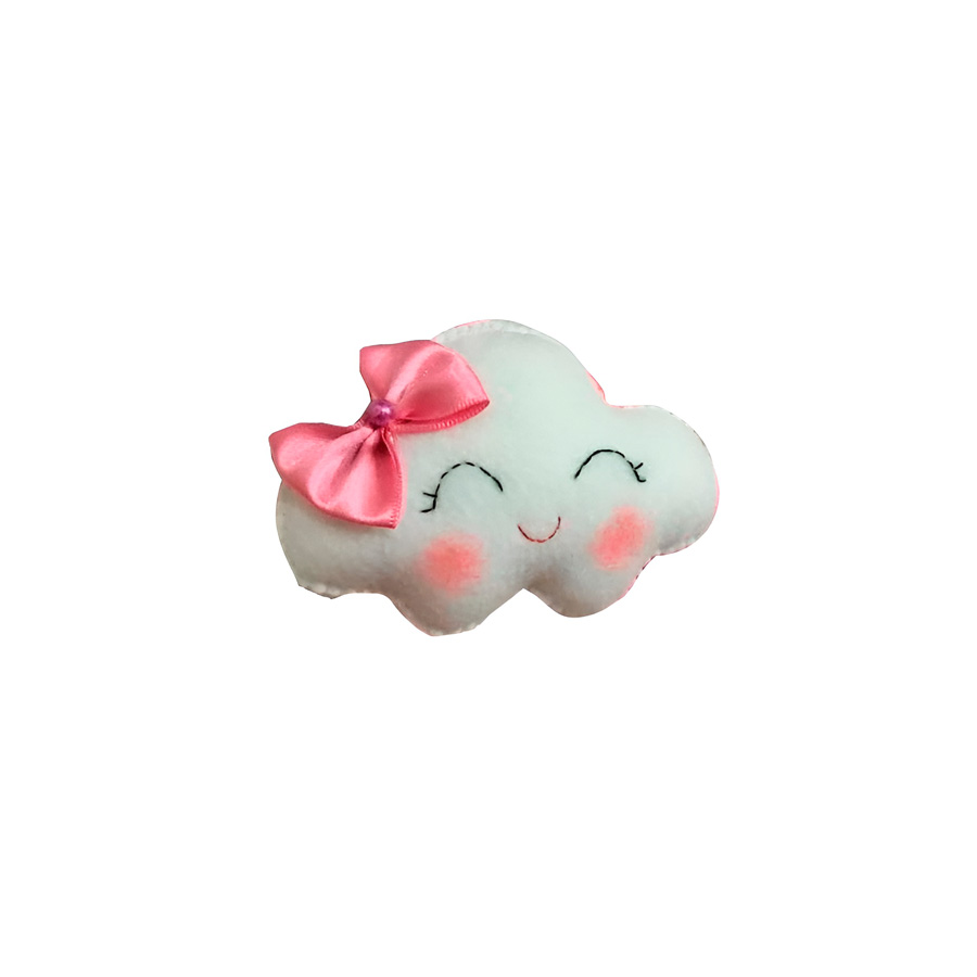 Chaveiro em feltro formato de nuvem com rosto amigável. Cores branco, rosa e preto.