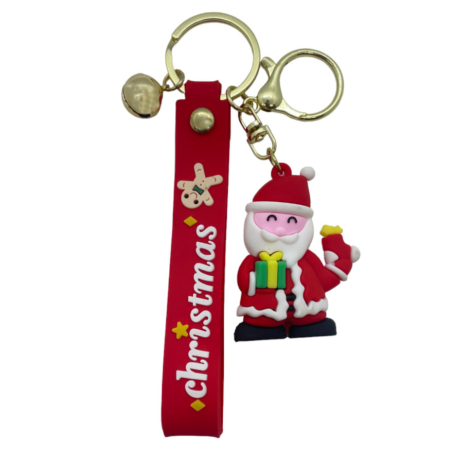 Chaveiro de Natal com Papai Noel segurando presente e Tira de silicone vermelha com escrito ''Christmas'' com detalhes de estrelinhas e biscoito de natal e sino