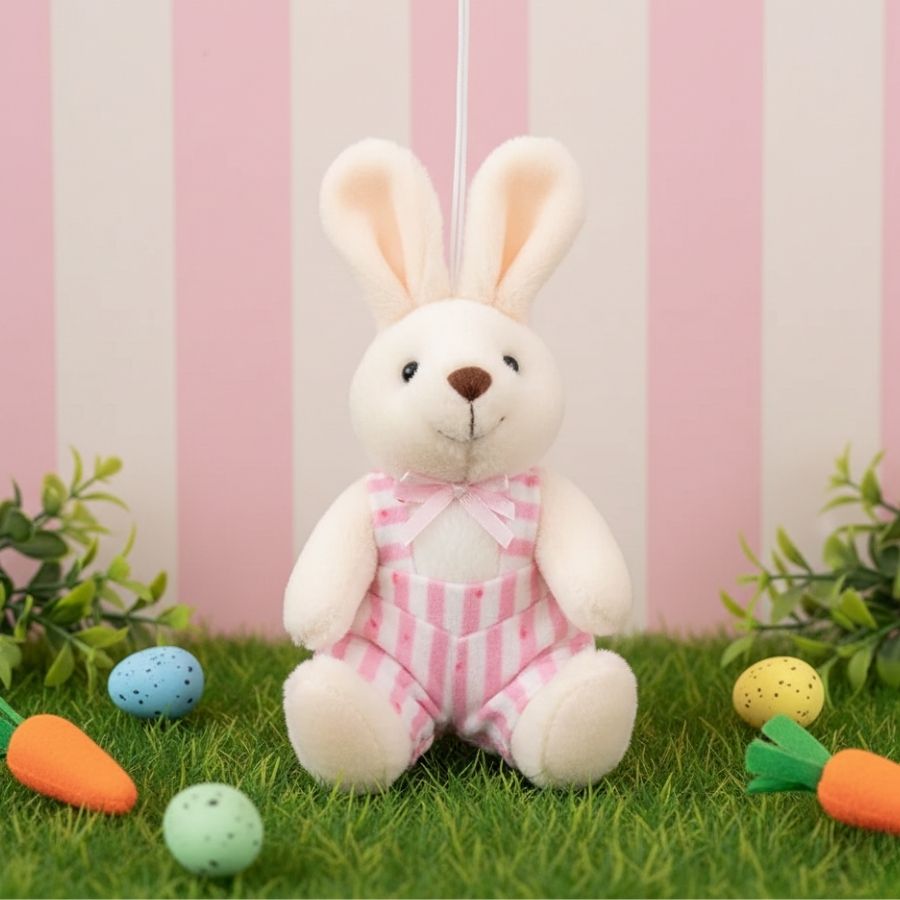 Coelha decorativa com roupa listrada nas cores rosa e branco