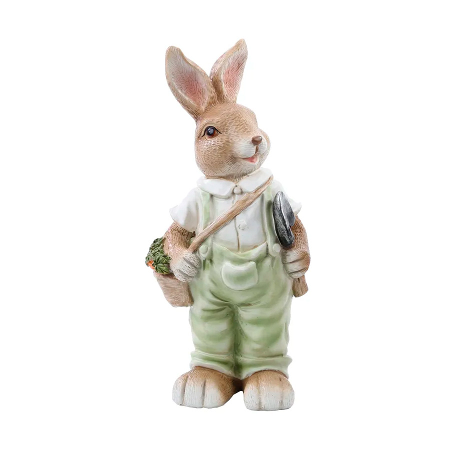 Coelho decorativo com pá na mão e carregando uma bolsa de cenouras