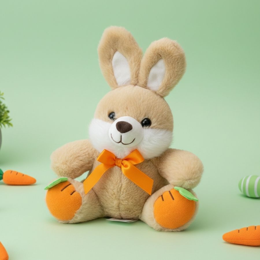 Coelho de pelúcia decorativo de 22,5 cm, com cenouras nos pés, ideal para decoração e composição de presentes com acabamento delicado e atrativo.