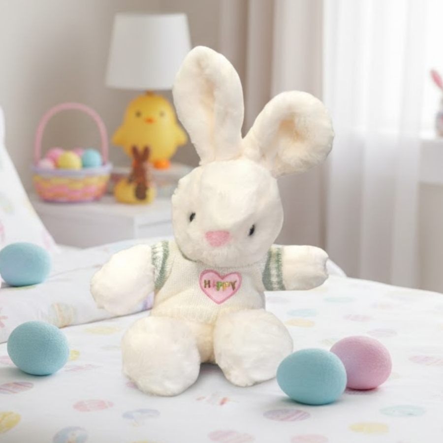 O Coelho de Pelúcia Branco com Suéter - Happy - 12x28x11cm é uma peça decorativa delicada e temática, ideal para compor ambientações de Páscoa e vitrines sazonais. Com acabamento em pelúcia branca e suéter com a inscrição “Happy”, transmite um visual alegre e acolhedor, agregando charme à decoração.