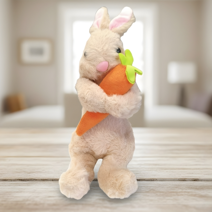 O coelho de pelúcia com cenoura na cor bege possui dimensões aproximadas de 10x18x14cm. Desenvolvido para uso decorativo, é indicado para composições em mesas, aparadores, nichos, vitrines e diferentes ambientações temáticas.