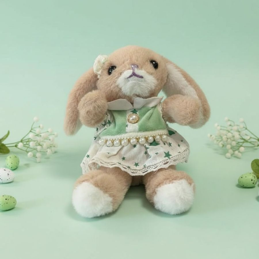 Coelho de pelúcia bege em posição sentada, com vestido branco e verde, ideal para decoração e presentes de Páscoa. Mede aproximadamente 17,5x12x7,5cm e adiciona delicadeza e encanto à composição pascal.
