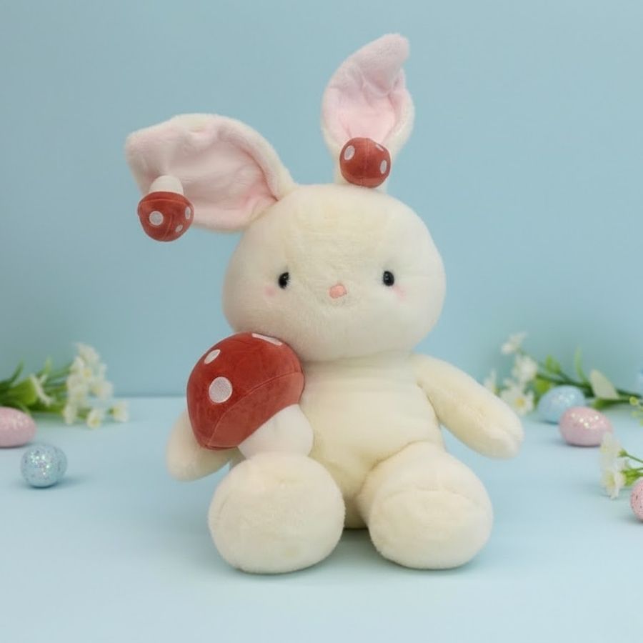 Coelho decorativo de pelúcia branca segurando um cogumelo, ideal para cenários e decorações de grande porte na Páscoa. Mede aproximadamente 85x44x19cm e combina impacto visual, magia e temática pascal.