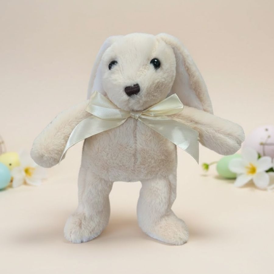 Coelho decorativo de pelúcia na cor creme com laço, perfeito para decoração e presentes de Páscoa. Mede aproximadamente 27x25x8cm e une delicadeza, charme e temática pascal.