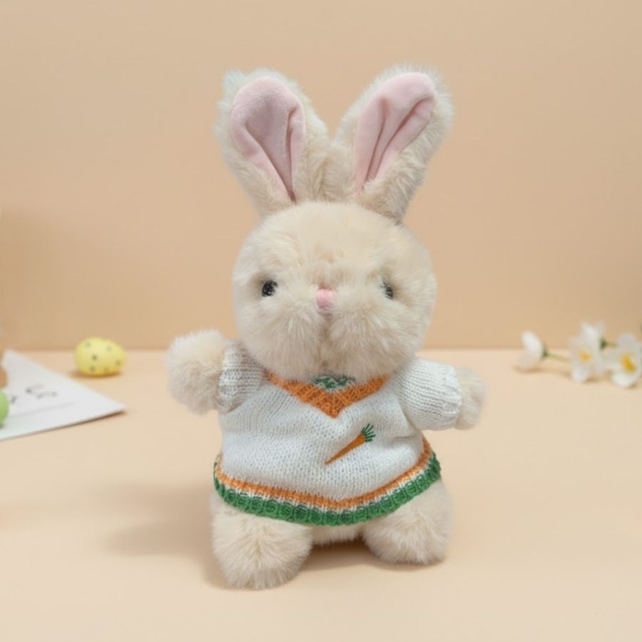 Coelho de pelúcia creme, vestindo suéter branco com cenoura decorativa (Branco, Verde e Laranja). Ideal para decoração e presentes de Páscoa, com medidas aproximadas de 26,5x18x9,5cm.