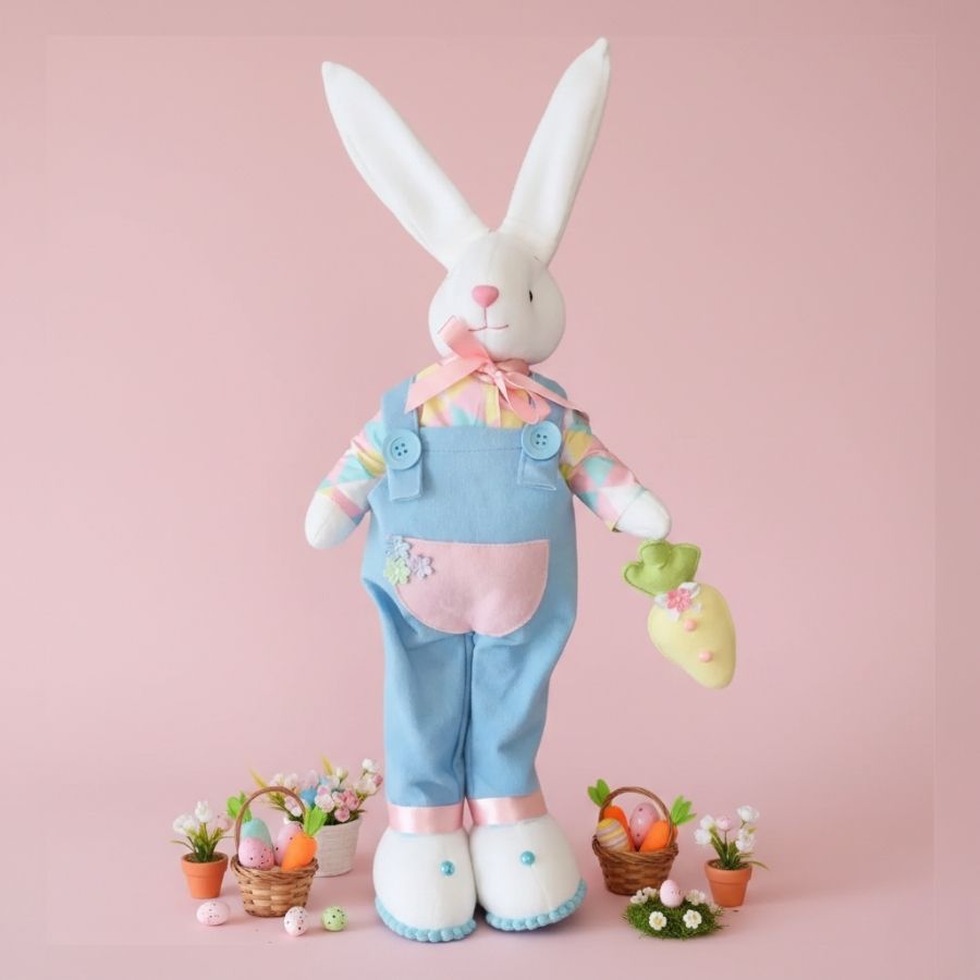 O Coelho Decorativo Em Pé com Cenoura é uma peça charmosa e delicada, perfeita para decorar ambientes infantis ou mesas de Páscoa. Confeccionada em tecido e isopor, esta coelhinha branca veste um macacão azul com detalhes rosa, segurando uma cenoura costurada à mão, trazendo alegria e estilo à sua decoração.