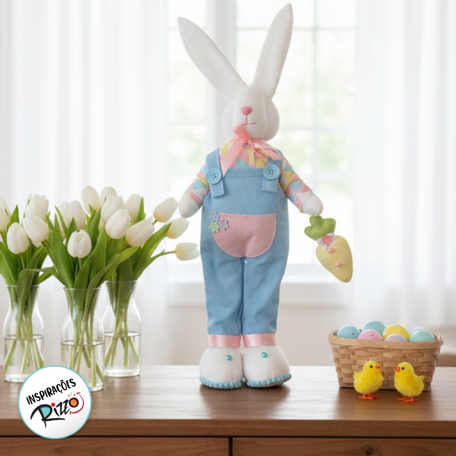 Com seus detalhes cuidadosamente trabalhados, como o macacão em tons suaves de azul e os detalhes em rosa, essa coelha decorativa é uma escolha encantadora para a decoração de quartos infantis, áreas de brincar ou mesmo para celebrar a Páscoa de uma maneira única e graciosa.