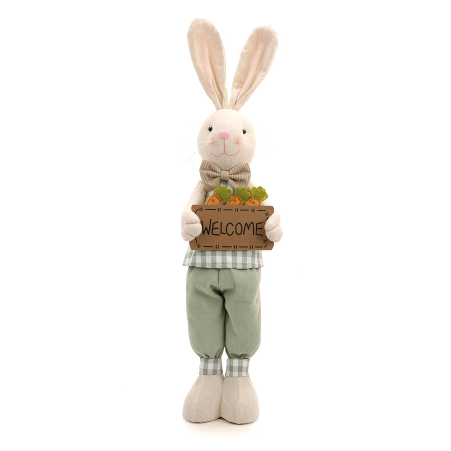 Coelho Decorativo em Pé com roupas e detalhes xadrez verde, segurando uma placa com cenouras, escrito "Welcome"