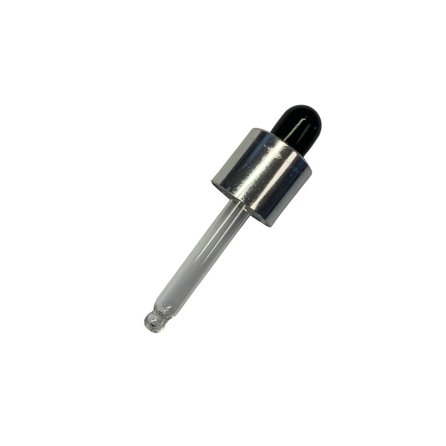 Conta Gotas Prime nas cores prata e preto com rosca 13/415, 6,25 cm de altura, acompanha bulbo de silicone mini preto e cânula de vidro mini gota, perfeitos para dosagem precisa em frascos pequenos usados em perfumaria e essências.