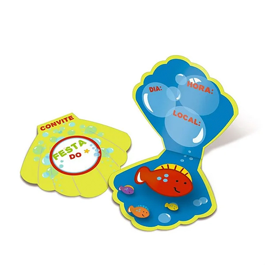 O Convite "Fundo do Mar" é uma representação encantadora do tema marinho, perfeito para convites de festas temáticas. Na parte frontal, destaca-se uma concha verde com um círculo central que contém a mensagem "Festa do ...". Ao abrir o convite, revela-se um cenário inspirado no fundo do mar, decorado com peixes e elementos marinhos, onde as informações importantes como dia, local e hora são inseridas dentro de bolhas, criando um ambiente mágico e visualmente atraente.