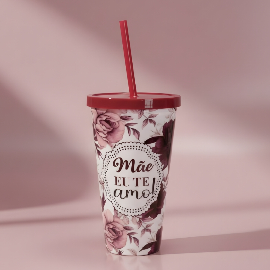Copo plástico na cor vinho, com capacidade de 600ml. Acompanha tampa e canudo. Possui estampa com a frase “Mãe Eu Te Amo”. Indicado para bebidas frias. Recomenda-se lavar antes do primeiro uso. Não utilizar em micro-ondas ou com líquidos muito quentes, salvo orientação diferente na embalagem do fabricante. Para preservar a estampa, evitar o uso de esponjas abrasivas e produtos químicos agressivos. Consultar o rótulo para informações adicionais sobre material, resistência térmica e conservação.
