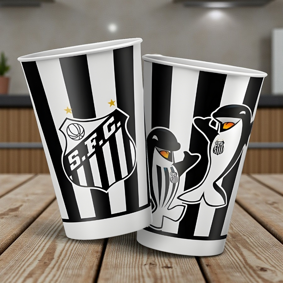 Copo de papel com estampa temática do Santos, capacidade de 180ml. Leve, descartável e fácil de usar, ideal para festas, eventos e comemorações de torcedores.