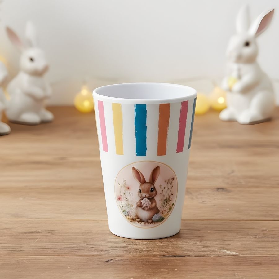 O produto é um copo decorativo de Páscoa, com temática de coelho com ovo, com capacidade aproximada de 350ml, indicado para uso decorativo e funcional em composições pascais.