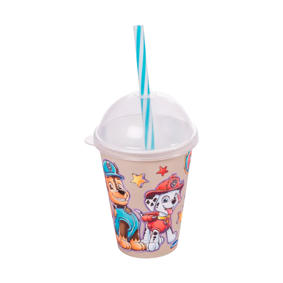 Mini copo de plástico com capacidade de 280ml, acompanhado por uma tampa em formato de meia esfera e canudo. Possui estampa temática da Patrulha Canina com fundo bege.