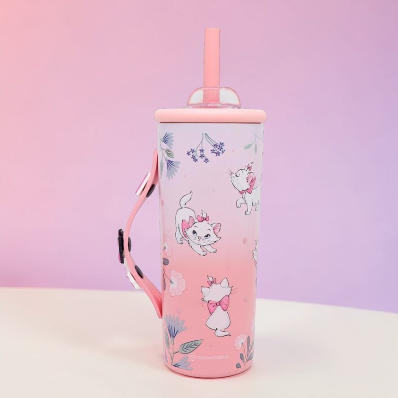 Esse copo é feito em aço inoxidável com detalhes em silicone e plástico PVC, e ajuda a manter bebidas geladas por até 12 horas e quentes por até 6 horas, tornando o uso ainda mais versátil ao longo do dia. Conta com tampa, canudo removível e flexível, além da opção de beber diretamente no copo, oferecendo mais praticidade em diferentes momentos. A alça removível facilita o transporte e os pins decorativos removíveis trazem um diferencial encantador que valoriza ainda mais o visual do produto. Também é livre de BPA e Disney Original, sendo ideal para quem procura um copo térmico Gata Marie bonito, funcional e cheio de personalidade para usar ou presentear.