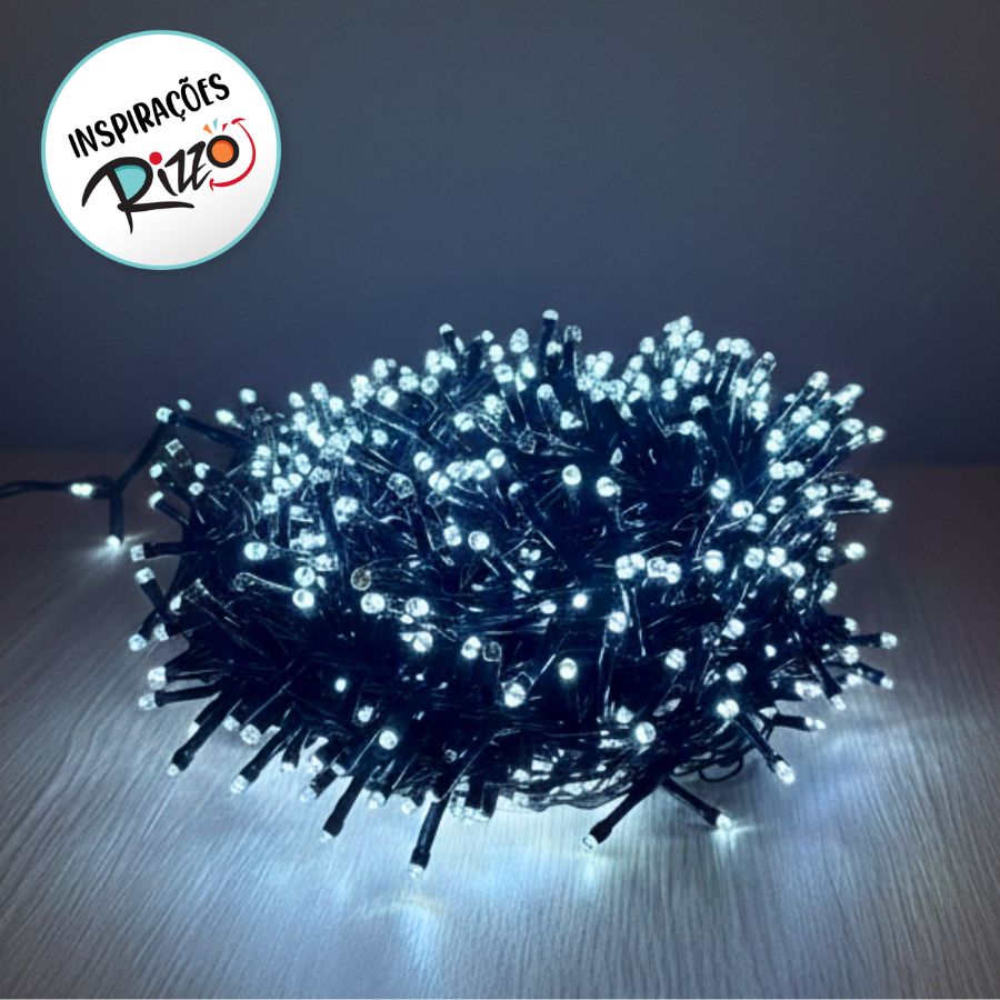 Cordão de luz LED de 10 metros, equipado com 1000 LEDs de luz fria (branca), ideal para iluminar ambientes internos e externos. As luzes apresentam efeito pisca-pisca, com strobos que piscam para adicionar um efeito dinâmico e vibrante à decoração. O fio verde permite que o cordão se integre discretamente em árvores de