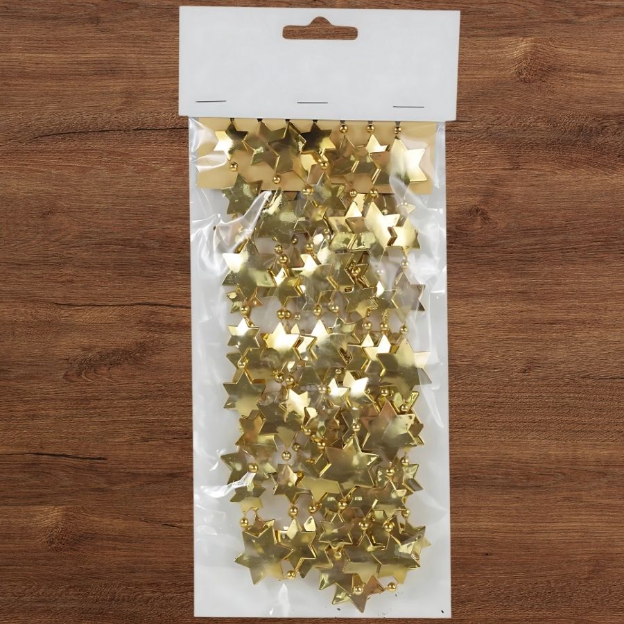 O Cordão com Estrelas Brilhantes Ouro possui 2,70 metros de comprimento e é confeccionado em material durável com acabamento metálico reluzente. Ideal para decorar árvores de Natal, guirlandas, mesas e outros ambientes, oferecendo charme e brilho à festa.