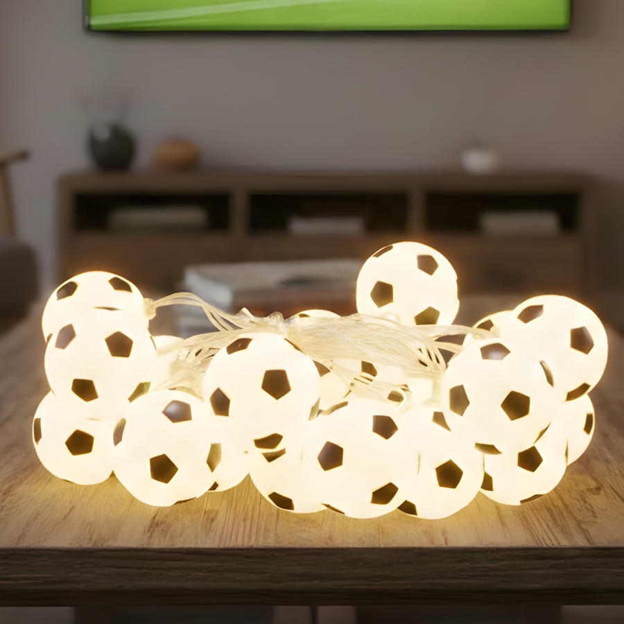 O Enfeite Decorativo Cordão LED - Bola de Futebol - 1,8m é ideal para compor ambientações temáticas com iluminação decorativa e visual descontraído. Com extensão de 1,8m e elementos em formato de bola de futebol, proporciona destaque em festas, quartos, vitrines e eventos esportivos.