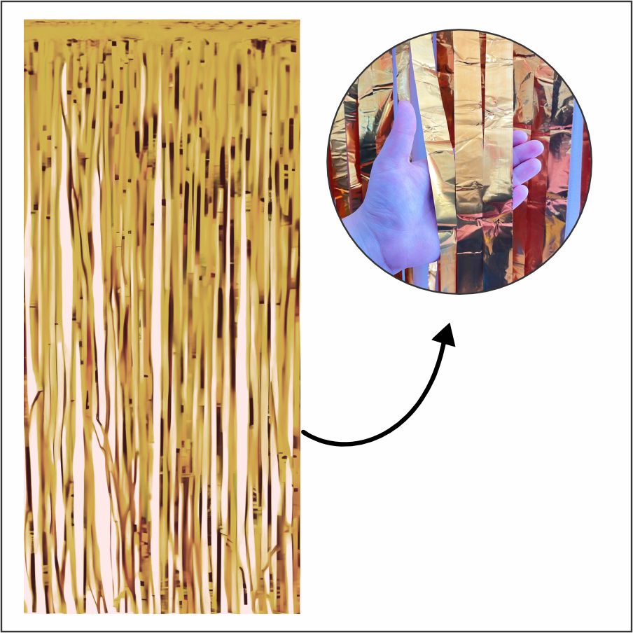Cortina decorativa metalizada dourada, perfeita para destacar ambientes em festas e eventos com brilho e sofisticação.